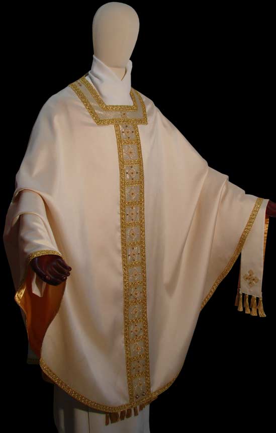 le casule in vendita sono sempre le stesse viste e riviste indossate da altri i prezzi sono inspiegabilmente molto alti se paragonati alla qualità media del prodotto è difficile chiedere una forma specifica di casula bianca solenne ( a ciascuno piace uno stile specifico) appena chiedi " possiamo fare una decorazione personale?", ti accorgi che il negoziante si incupisce e inizia a muovere la testa preoccupato per quello che potresti chiedergliCapisco perfettamente questi problemi, perché credo che ogni sacerdote debba poter esigere la casula bianca solenne che meglio si attagli alla propria corporatura ed al proprio stile liturgico.